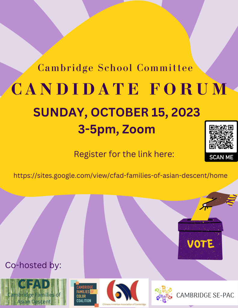 The forum is co-hosted by Cambridge Special Education Advisory Council (SE-PAC), Cambridge Family of Asian Descent, Cambridge Families of Color Coalition (CFCC), and Chinese American Association of Cambridge (CAAC).