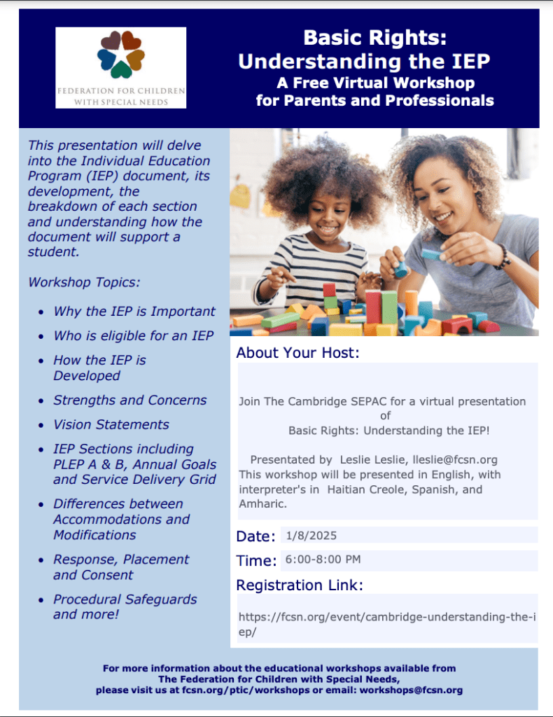 Registration Link: https://fcsn.org/event/cambridge-understanding-the-iep/